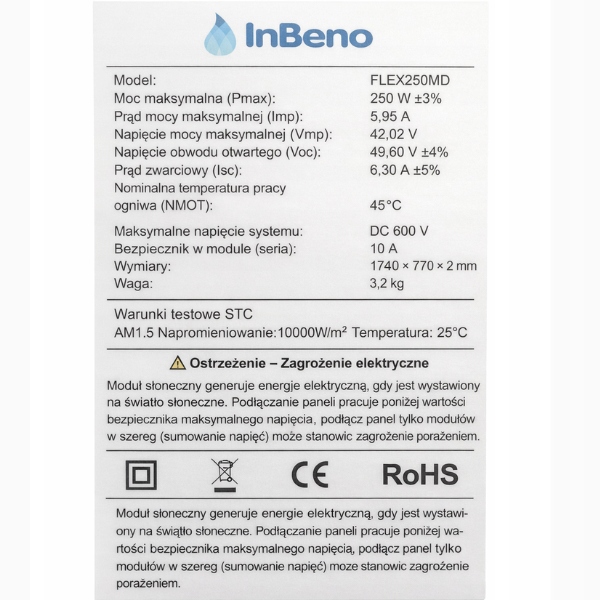 Nowoczesny panel fotowoltaiczny o mocy 250 W o elastycznej konstrukcji – pozwala instalować na nierównych powierzchniach (np. dach kampera, łódź). Panel przetwarza energię słoneczną na prąd stały do ładowania akumulatorów 12 V i 24 V.